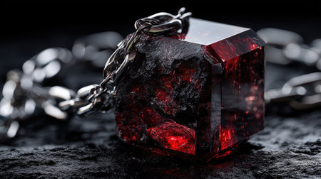 Captivating close-up of a vibrant red gemstone nestled among silver chain elements, showcasing intricate textures and reflections against a dark backdrop.
