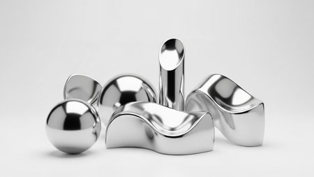 A collection of polished metallic abstract geometric shapes and spheres are arranged on a clean white background...