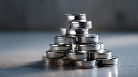 A captivating close-up image of a stack of shiny metal coins arranged in a pyramid, featuring soft lighting that highlights the coins' texture and reflective surfaces.