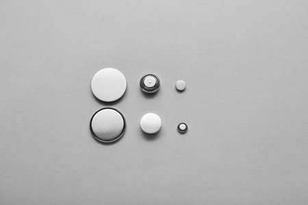 Titanium ore chunks, with their characteristic shiny metallic surface, arranged on a grey backdrop. No people, copy space