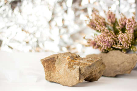 A gentle background for the presentation. Stones and small pink flower buds. Stylish appearance, layout, personality. Banner, a place for text. selective focus. The concept of cosmetics for care.