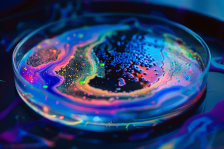 Petri dish with vibrant colorful bacterial culture. Laboratory research with agar plate. Microbiology science. Microorganism experiments with growth medium for biology studies.