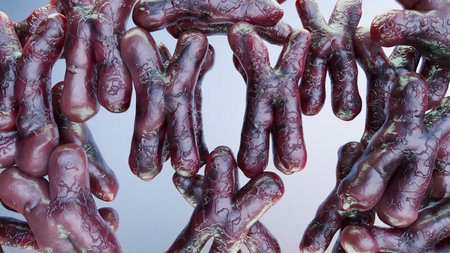 This artwork depicts chromosomes, highlighting their structure and genetic connectivity in cell division, emphasizing biology.