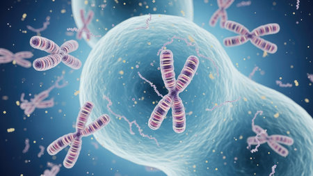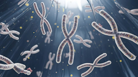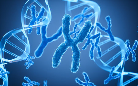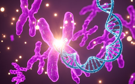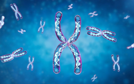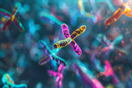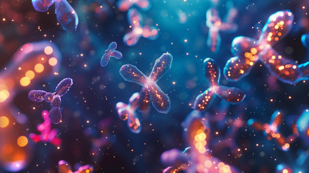 An illustration features multiple chromosomes suspended against a dark blue background, with bright light rays. The composition showcases a digital art style with soft lighting and highlights. This image is suitable for scientific publications, educational resources, and visual communication projects related to genetics or biology.