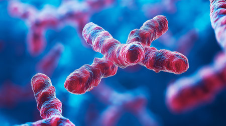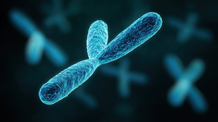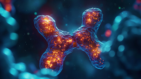 An AI generated illustration of A detailed, magnified view of X-shaped chromosomes, illuminated to highlight their complex structure.