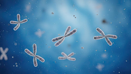 This image features several chromosome structures, illustrated against a blue, blurred background. The chromosomes appear in a detailed, scientific style, exhibiting a cross-like shape. The color palette primarily includes blue and gray tones, suggesting a cellular environment. This graphic is suitable for use in educational materials or scientific publications.