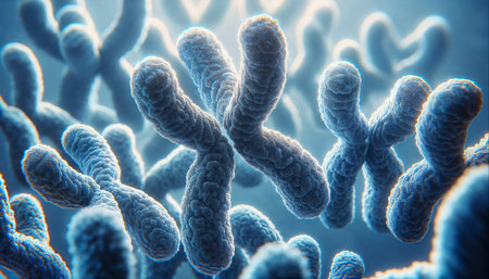 This image features a detailed illustration of chromosomes, set against a blurred, blue backdrop. The visual style is suggestive of scientific or medical visualization, with a focus on biological structures. The composition uses depth of field and soft lighting to create a sense of three-dimensionality. It could be suitable for educational materials or science-related publications.