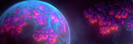 Bright neon fractal patterns illuminate a spherical form in a cosmic background, creating a surreal and captivating scene.