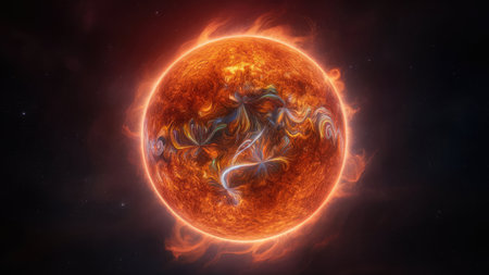 Glowing star surface with radiant plasma and magnetic storms on a dark cosmic background, depicting a detailed view of a sun-like celestial body.
