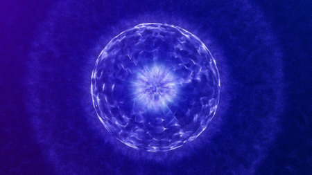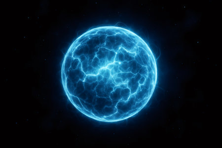 Glowing plasma sphere radiating intense energy, surrounded by electric lightning, set against a futuristic blue background.