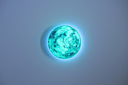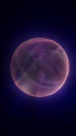 A glowing, translucent sphere in cosmic colors, radiating soft light against a dark background.
