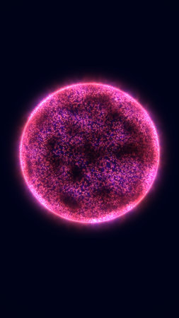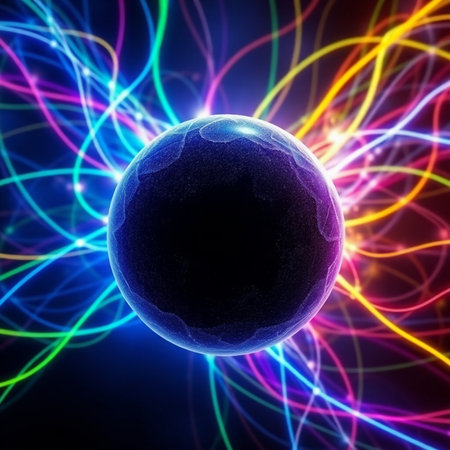 An illustration features a glowing sphere emitting electric discharges. The image displays a central core surrounded by vibrant colors with a darker environment. This visual is created with digital techniques, emphasizing energy and movement, suitable for scientific, technological, and conceptual projects.