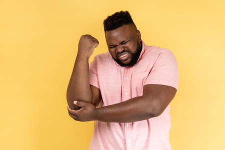 Portrait of man wearing pink shirt massaging aching elbow, frowning from acute pain, strain and strain problem, trapped nerves, rheumatoid arthritis. Indoor studio shot isolated on yellow background.