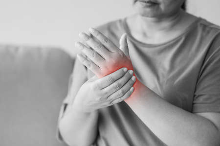 Arthritis person, finger woman ache from working in office. Concept office syndrome hand pain from occupational disease, woman having wrist pain from using laptop computer, wrist pain.