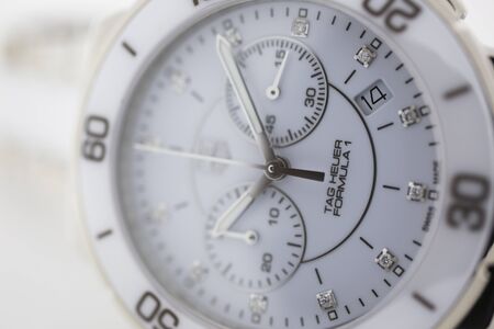 Chaux-de-Fonds, Switzerland, August 21 2019 - The close up of Tag Heuer Grand Carrera watch, a famous swiss made luxury wrist watch from Switzerland manufacturing clock company