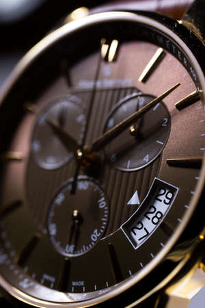 Geneve, Switzerland 01.10.2020 - Claude Bernard man swiss made watch close up detail selective focus, date indication 28. Swiss watchmaker, watch manufactory brand MONTRE EDOX group