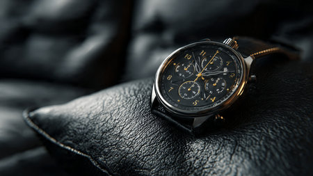 A detailed macro shot of a sophisticated men's chronograph watch, showcasing its intricate dials and elegant design.