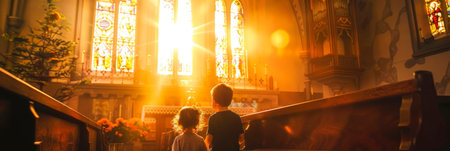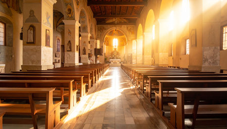 Sunlight pours through intricate stained glass windows, filling the beautiful church interior with an enchanting glow. The majestic space.