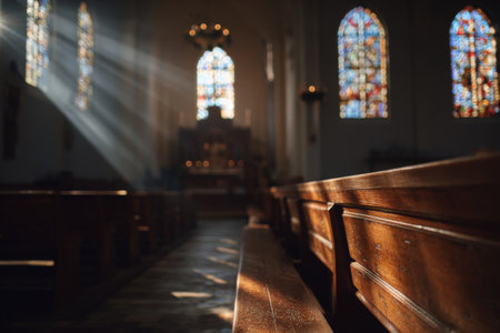 Sunlight illuminates the wooden pews of a church, drawing the eye towards the altar at the front. Stained glass windows add a colorful glow, enhancing the serene atmosphere.