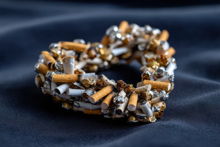 A heart shape made of cigarette butts lies on dark fabric background, symbolizing harmful effects of smoking. arrangement is both artistic and thought provoking, highlighting health concerns