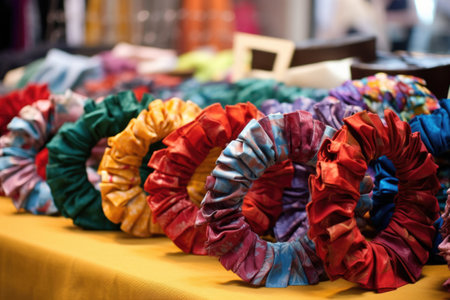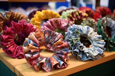 A vibrant collection of colorful hair scrunchies displayed neatly at a craft fair