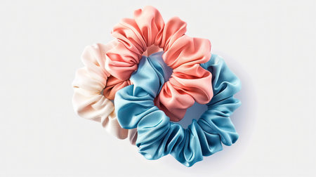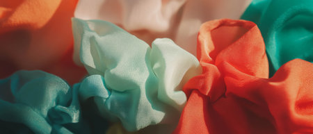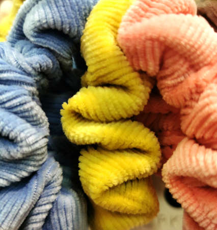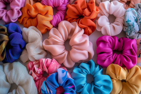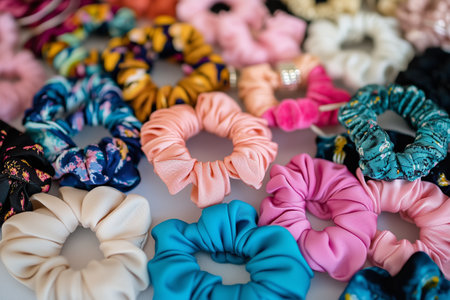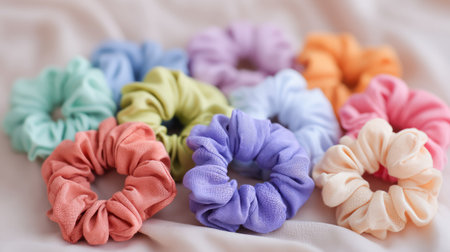 Colorful hair scrunchies with soft fabric and elastic bands in vibrant textures