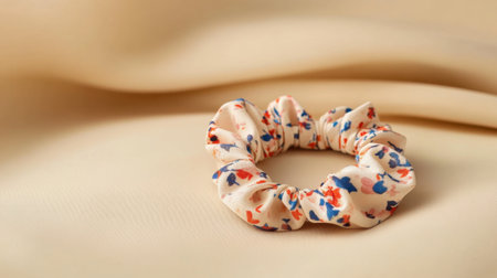 This image showcases a delicate floral scrunchie elegantly resting on soft beige fabric, perfect for enhancing any hairstyle or fashion look.