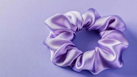 This image features a luxurious lavender scrunchie made from silky fabric, resting on a smooth purple backdrop. Ideal for beauty and fashion projects.