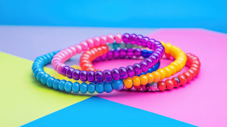 This image showcases a collection of colorful beaded bracelets on a vivid geometric background, perfect for themes of creativity, fashion, and youthfulness.