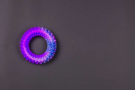 Erection ring with spikes on a gray background. Multicolored rubber ring for penis stimulation. Top view, flat lay. Copy space