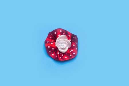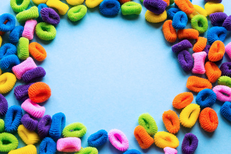 Colorful hair ties on a blue background. Colorful background. Copy space.