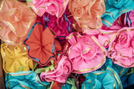 A vibrant display of colorful textiles and flowers in shades of orange, pink, and magenta on a sunny yellow background. This artful arrangement exudes a happy and joyful vibe, perfect for any event