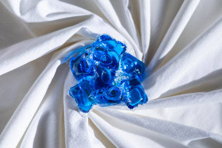 Washing gel capsule pods with laundry detergent on a pile of white cloth background