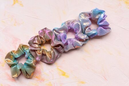 Four trendy holographic iridiscent shiny metallic scrunchies on pink background. Diy accessories and hairstyles concept, copy space