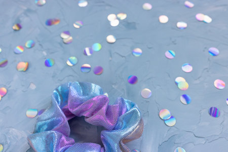 One trendy holographic iridiscent shiny metallic scrunchy and metallic silver confetti on blue background. Diy accessories for Christmas and New Year holiday party and hairstyles concept, copy space