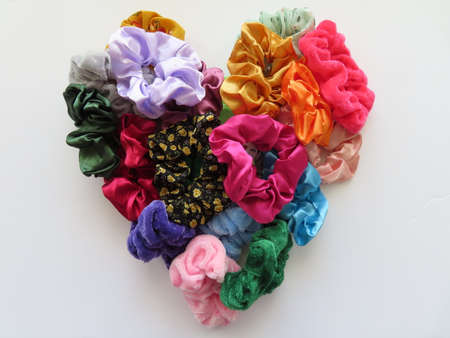 Various colorful mixed scrunchies hair accessory in the shape of a heart.