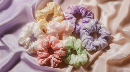 This image features a collection of pastel satin scrunchies elegantly arranged on a soft fabric backdrop, creating a stylish display for hair accessories.