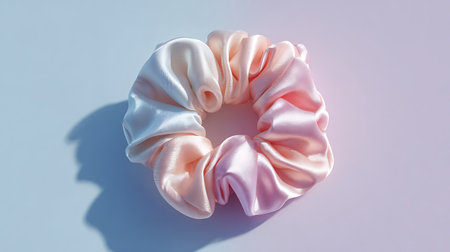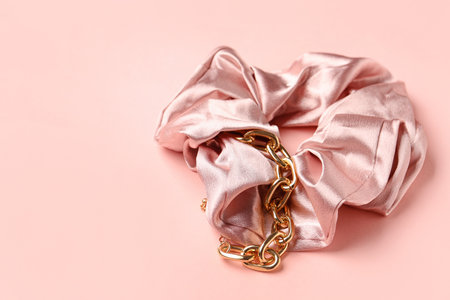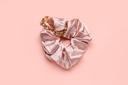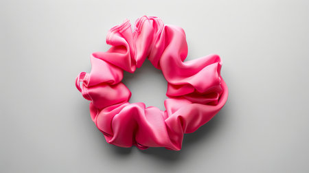 Pink silk hair scrunchie on a white background. Concept of hair accessory, fashion, beauty styling. Copy space.