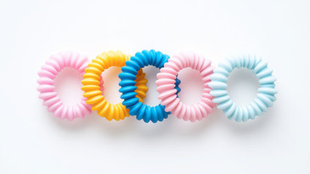 A collection of colorful hair ties arranged on a white background. This vibrant accessory set is perfect for adding a touch of fun to any hairstyle.