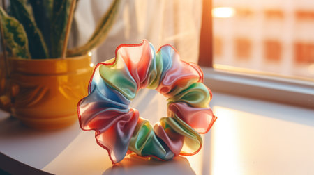 AI Generated. Colorful Silk Scrunchie on Bright Yellow Background for Fashion Trends