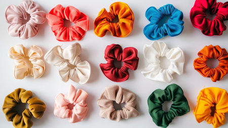 Colorful assortment of hair scrunchies on a white background. Concept of beauty accessories, fashion haircare, personal styling.
