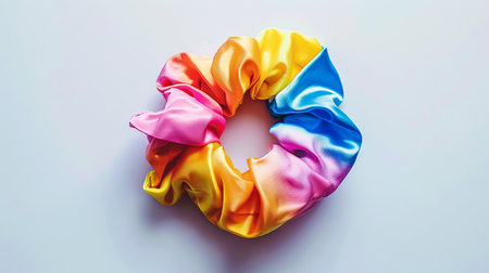 Colorful silk scrunchie on a white background. Concept of hair accessory, rainbow-themed fashion, bright colors, hairstyle decoration. Copy space.