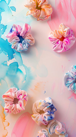 Colorful scrunchies on an artistic paint-splattered background. Concept of hair accessories, fashion, creative design. Vertical.