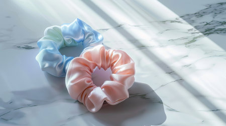 Pastel colored scrunchies on a marble surface. Concept of fashion accessories, hair care, and feminine style. Copy space.