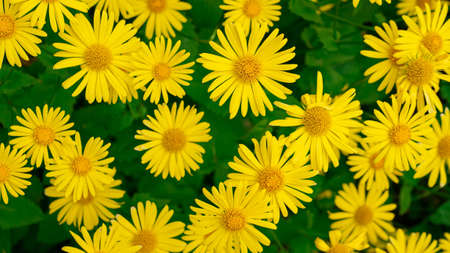 Yellow Doronicum flower Yellow Chamomile on blurred green background. Spring colors. Copy space background