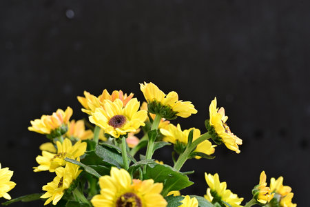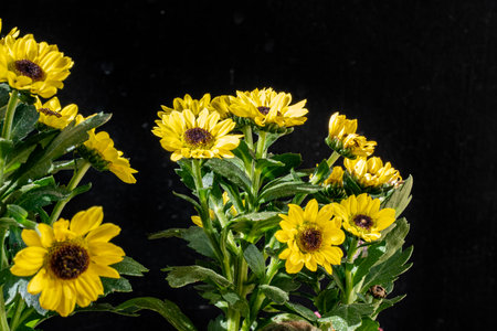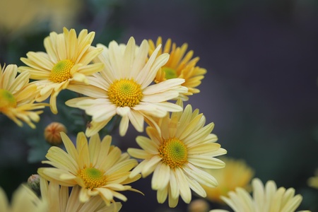 Beautiful yellow Chrysanthemum flowers on a dark background. Close up. Selective focus. Place for text.