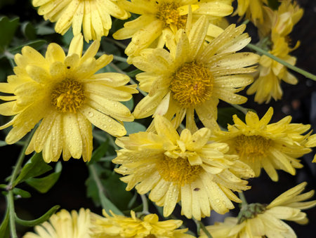 Chrysanthemum flowers as a background. Field of yellow Chrysanthemums after the rain. Selective focus