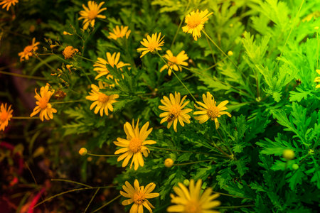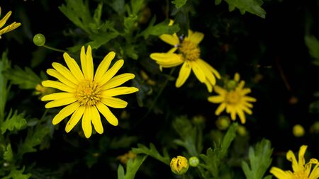 field of blooming yellow flowers on a dark tone background of green garden leaves. beautiful of Spring Summer .bright and light up day concept idea