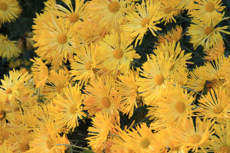 Multilobe yellow chrysanthemums blooming in the fall in a botanical park in Ukraine.