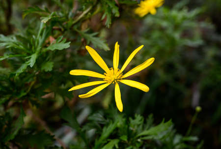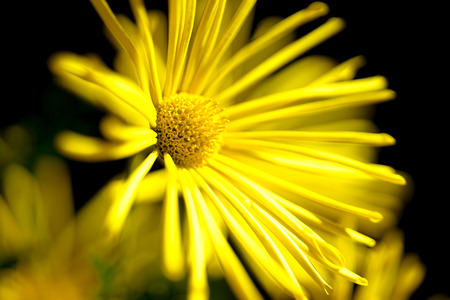 Doronicum orientale yellow flower close up. Also known as leopards bane flowers. Daisy like flower, moody background.